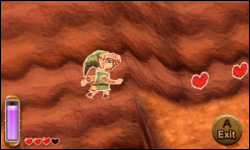 Als es für Yuga brenzlich wird, verwandelt er Link in eine Wandmalerei und verschwindet... Womit Yuga allerdings nicht gerechnet hat, war die Kraft von Ravios Armreif. Dieser macht euch wieder normal und versorgt euch ab sofort mit der Fähigkeit, sich jederzeit in eine Wandmalerei zu verwandeln. Durch einen Spalt in der Wand der Bosskammer geht es nach draußen, wo man auf eindrucksvolle Art die neue Fähigkeit lernt, indem man sich über die Außenmauern des Ostpalastes seinen Weg bahnt. Auch gibt es lila Magieflaschen, die eure Energie-Leiste sofort wieder auffüllen. Ich kann hier nur die Vermutung anstellen, dass die von mir unerforschten Bereiche des Dungeons über die neue Fähigkeit erreichbar sind, entschloss mich aber dazu, lieber im Abenteuer voran zu schreiten.