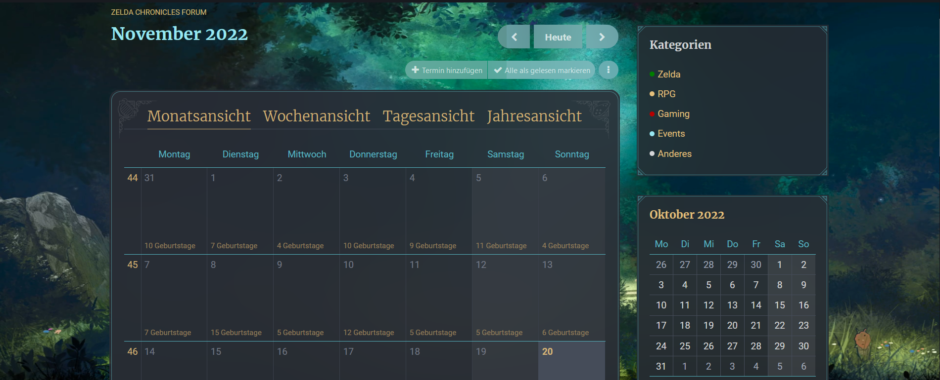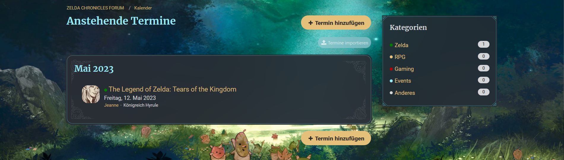 Unser neuer Kalender bietet euch künftig eine Übersicht, was Termine angeht: Während Geburtstage automatisch eingetragen sind (wenn der User das Datum im Profil angegeben hat), könnt ihr auch eigene Termine erstellen und sie einer der vorgegebenen Kategorien zuordnen. Für Termine, die der Kategorie "Zelda" zugeordnet sind, wird dabei automatisch ein Thema in "Zelda - Generell & Diskussion" erstellt, bei "Gaming" ein Thema im gleichnamigen Forum.